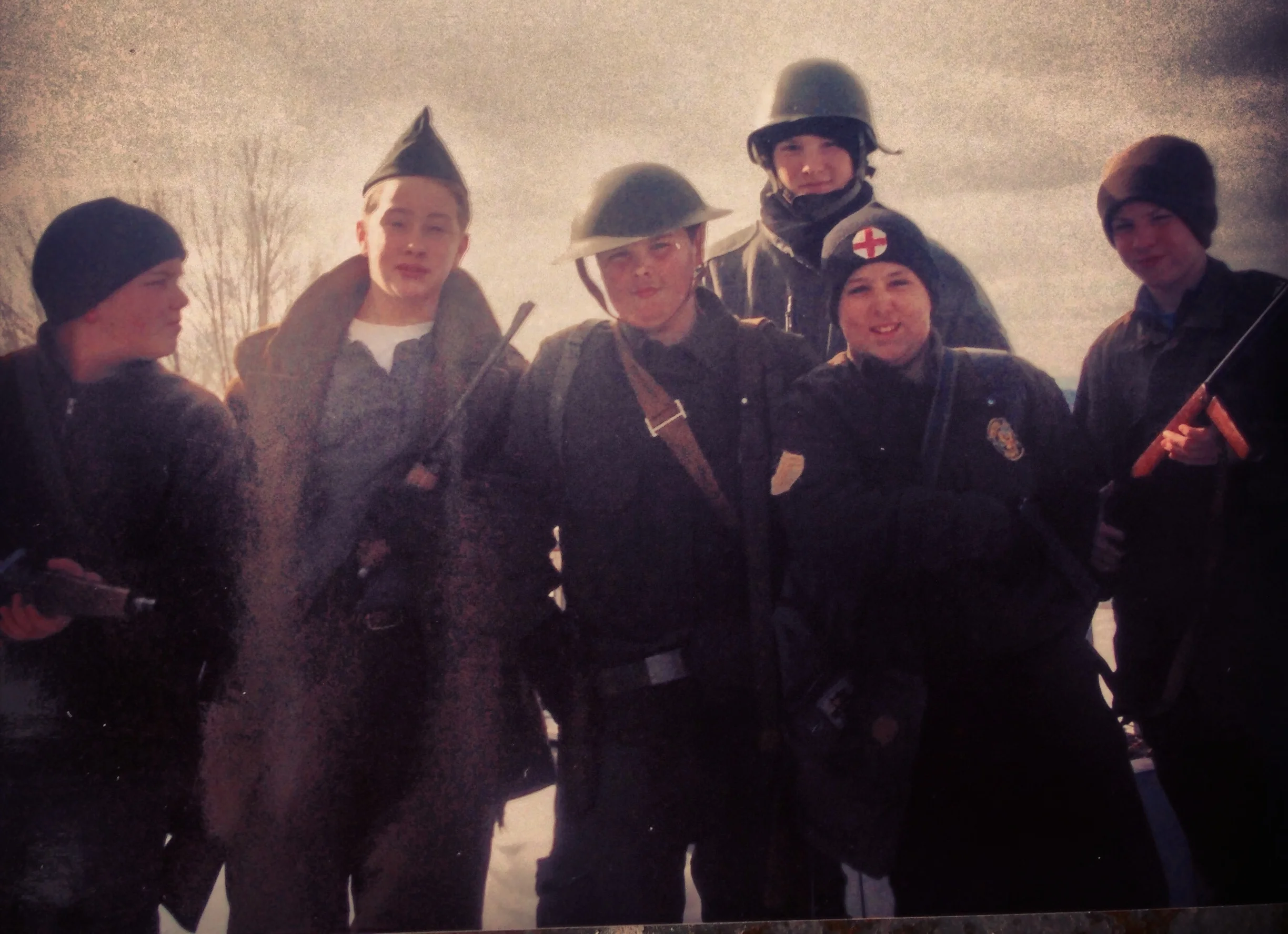 Behind the scenes of one of the early movies"The Black Hand Gang" 2002. Second from the left is a young John Stegemann, Production Designer and long time Producer. Center Middle is Steve Powers, and in back is Jim Powers.